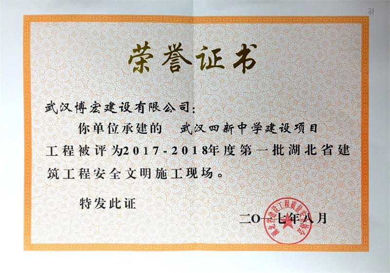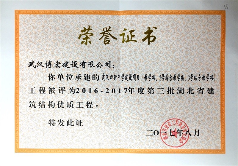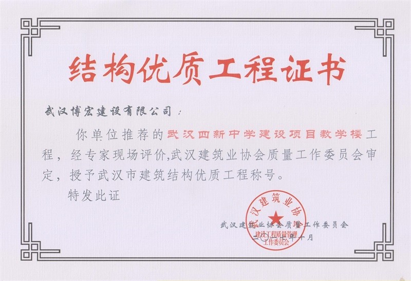 結(jié)構(gòu)優(yōu)質(zhì)工程證書(shū)(武漢四新中學(xué)教學(xué)樓)