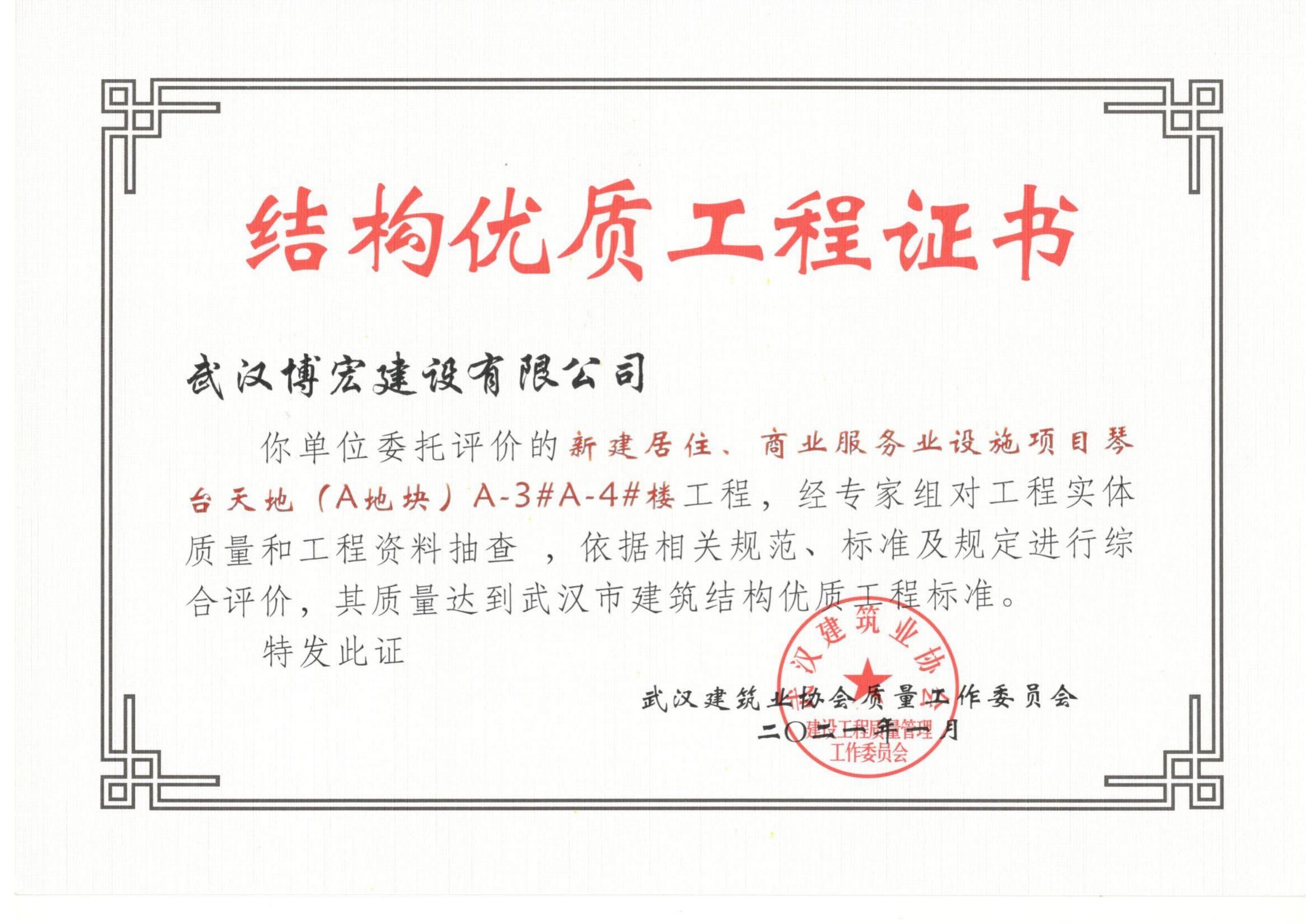 2021年武漢市結(jié)構(gòu)優(yōu)質(zhì)工程(琴臺天地(A地塊)3、4棟
