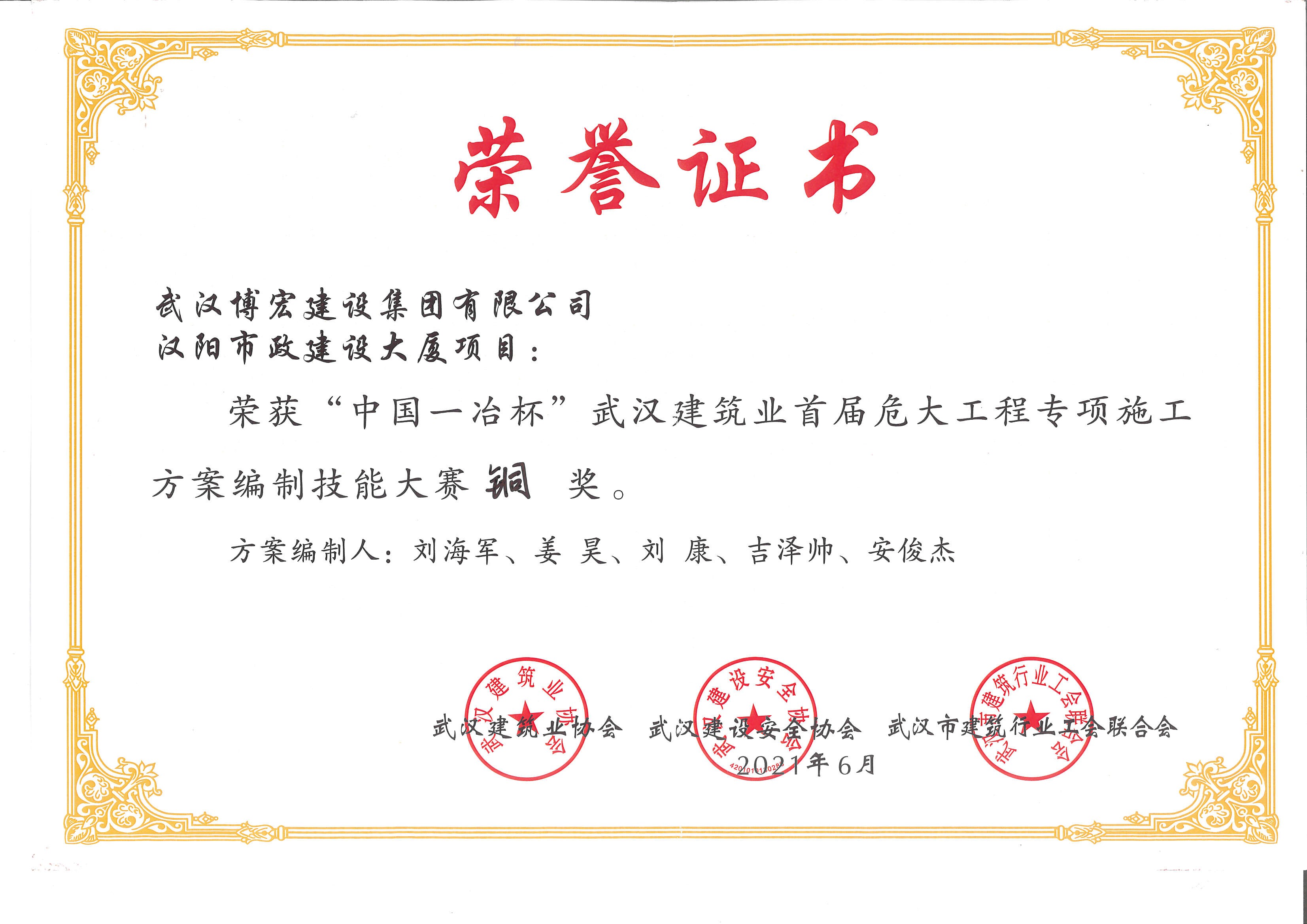 中國一冶杯武漢建筑業(yè)首屆危大工程專項(xiàng)施工方案編制技能大賽銅獎