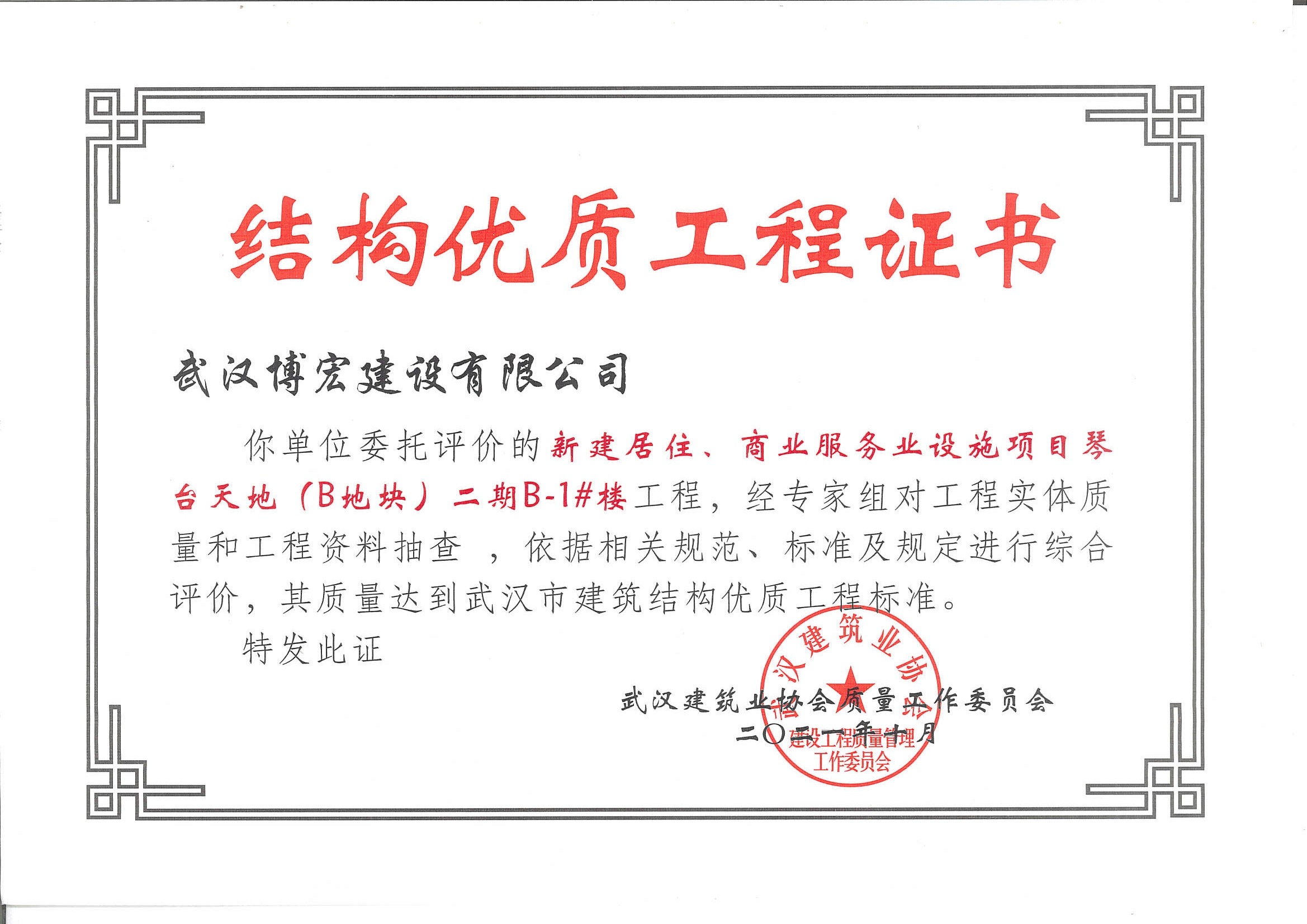 琴臺天地(B地塊)二期B-1#樓武漢市建筑結(jié)構(gòu)優(yōu)質(zhì)工程