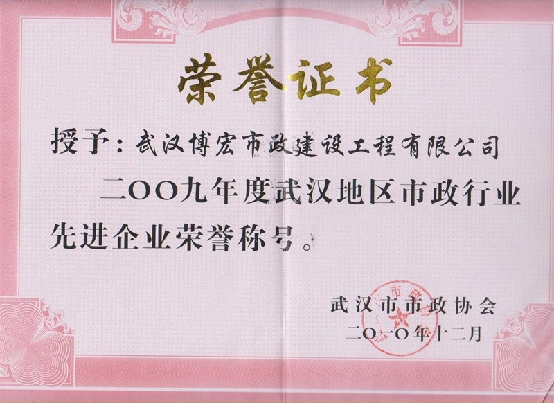 2009年度武漢地區(qū)市政行業(yè)先進(jìn)企業(yè)榮譽稱號