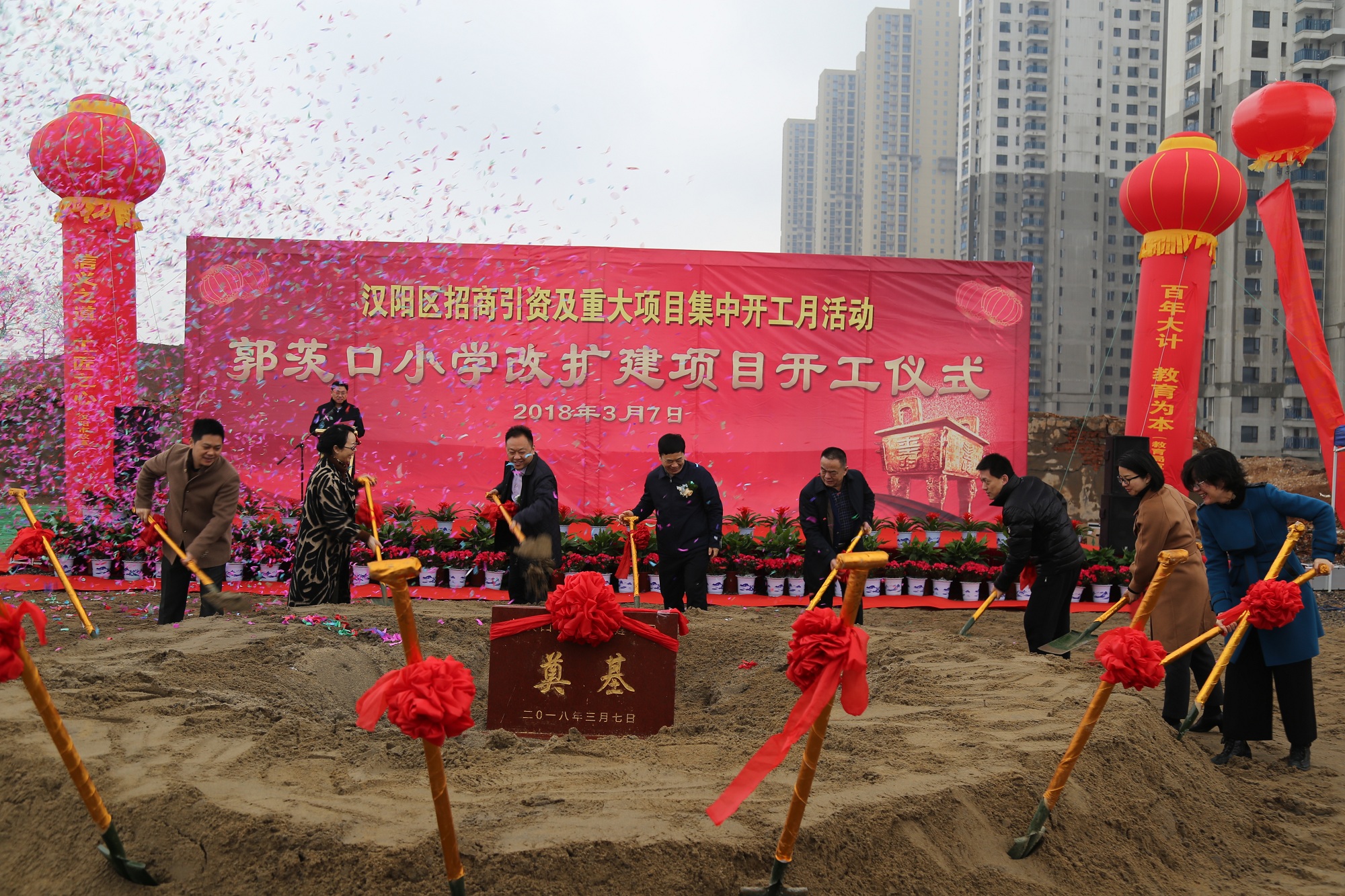 莫道春來早,更有早行人。2018年3月7日上午,漢陽區(qū)招商引資重大項目集中開工活動走進郭茨口小學改擴建項目。漢陽區(qū)委書記馬澤江,區(qū)長閻磊,區(qū)政協(xié)主席張本滿,區(qū)人大副主任黃學真,副區(qū)長蔡松、胡勇、皮惠蘭,區(qū)教育局局長施慧芳,漢陽市政總經(jīng)理虞志鵬、副總經(jīng)理王智高,天創(chuàng)房地產(chǎn)總經(jīng)理張琴,博宏建設(shè)董事長錢濤等蒞臨開工儀式現(xiàn)場。