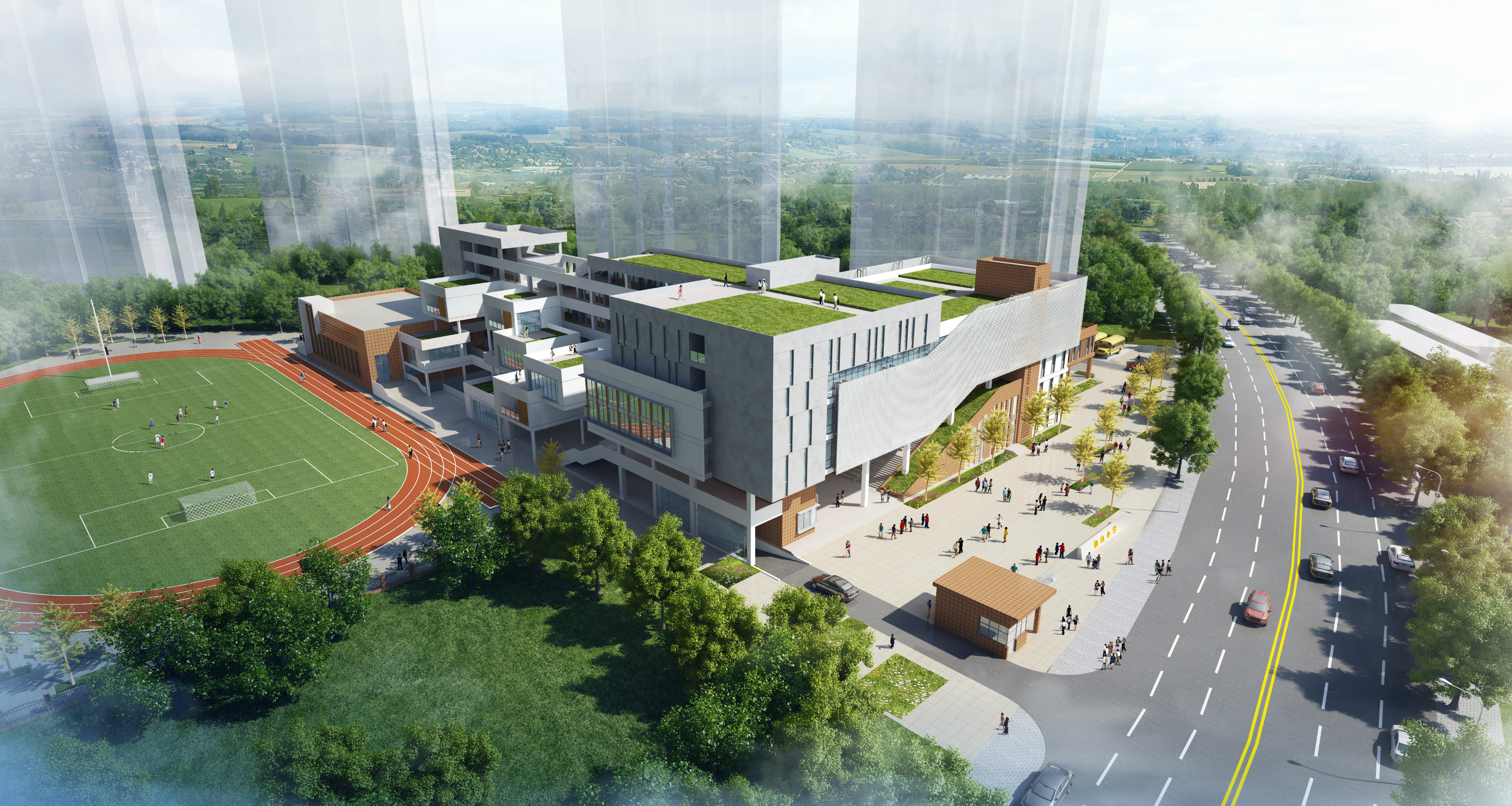 建設(shè)內(nèi)容:1棟教學(xué)綜合樓,建筑面積 20640.00 ?㎡,共六層;1 棟風(fēng)雨操場(chǎng),建筑面積 1230.00 ㎡,共二層;地下室建筑面積 12959.00㎡,其中學(xué)生食堂 492 ㎡、報(bào)告廳 582㎡、車庫及設(shè)備用房 11885㎡ 。新建運(yùn)動(dòng)場(chǎng)地,包括田徑場(chǎng)、籃球場(chǎng)、足球場(chǎng)等;同時(shí),配套建設(shè)校區(qū)大門、圍墻、廣場(chǎng)、道路、管網(wǎng)管線、景觀綠化等。