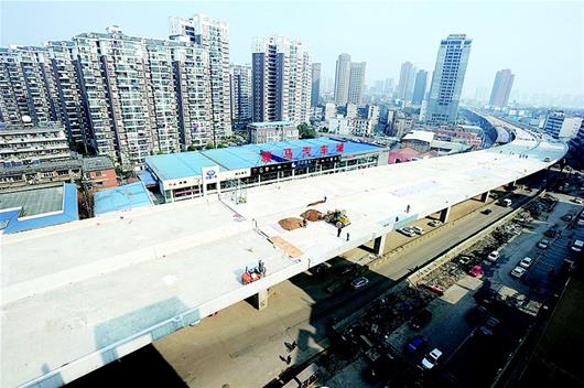 昨日,記者來(lái)到雄楚大街改造工程指揮部發(fā)現(xiàn),這里異常繁忙,工人們都在忙著搭腳手架、趕進(jìn)度。記者看到,雄楚大街高架梅家山立交至武漢理工大學(xué)段橋面已全線貫通,整條高架已成形。對(duì)接二環(huán)線珞獅南路高架的接線,正在緊張施工中。施工方介紹,昨日貫通的一段將于今年五一通車。據(jù)了解,二環(huán)線漢陽(yáng)方面,只剩下龍陽(yáng)大道墨水湖北路至知音橋段仍在施工中,其他路段均已通車。