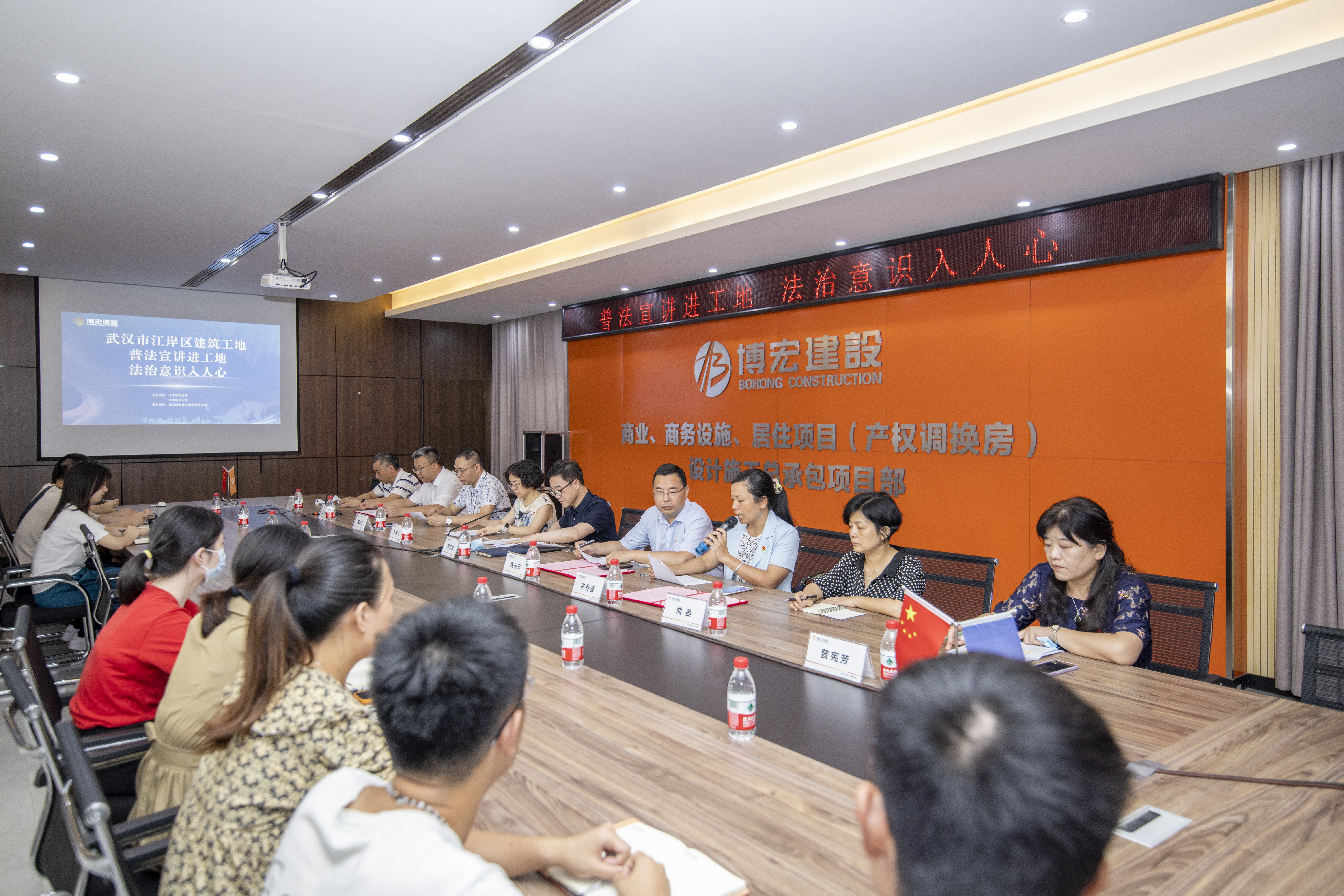 為切實保障建筑工人合法權(quán)益,提高各參建單位依法合規(guī)意識,樹立良好的法治觀念,7月7日上午,江岸區(qū)“普法宣講進工地,法治意識入人心”活動在博宏建設(shè)集團承建的商業(yè)、商務設(shè)施、居住項目(產(chǎn)權(quán)調(diào)換房)舉行。江岸區(qū)司法局黨組書記、局長周萬青,江岸區(qū)建設(shè)局黨委委員、副局長黃向東,江岸區(qū)建管站黨支部書記、站長王衛(wèi)綱等相關(guān)領(lǐng)導和相關(guān)專業(yè)律師參加了此次活動?;顒硬捎镁€上線下相結(jié)合的方式,全區(qū)70余家項目工地、近2000名建筑工人線上觀看了直播。