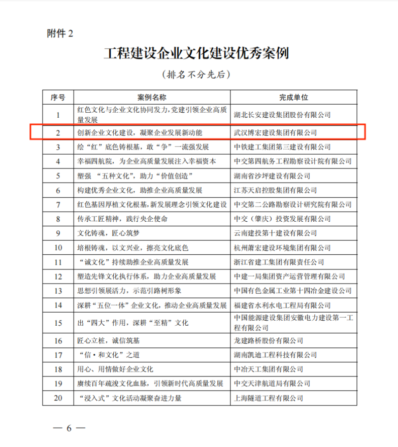 本次榮譽(yù)的獲得是對公司積極推進(jìn)企業(yè)文化建設(shè)工作成果的肯定,未來博宏建設(shè)集團(tuán)將繼續(xù)全面做好企業(yè)文化建設(shè)各項(xiàng)工作,凝聚全體員工的干事熱情,努力打造競爭型、管理型、質(zhì)量型的一流房建企業(yè)。