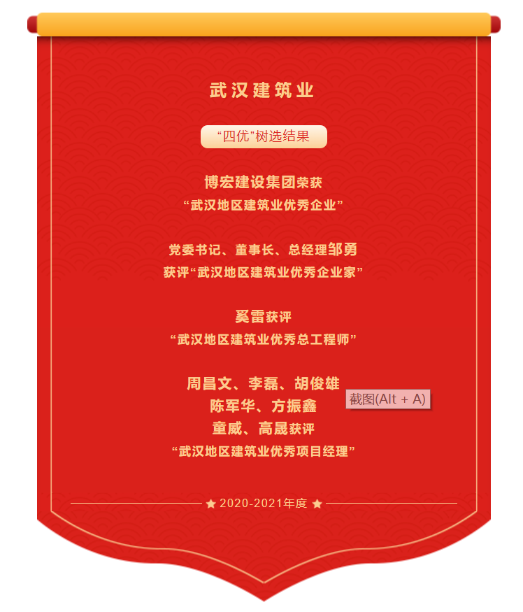 ? ? ? ? 近日,武漢建筑業(yè)協(xié)會發(fā)布2020-2021年度武漢地區(qū)建筑業(yè)優(yōu)秀企業(yè)、優(yōu)秀企業(yè)家、優(yōu)秀總工程師、優(yōu)秀項目經(jīng)理(以下稱為“四優(yōu)”)選樹結(jié)果。經(jīng)會員單位自主申報、協(xié)會組織專家評審、主管部門復(fù)核、武漢建協(xié)三季度會長辦公會審議通過并在協(xié)會網(wǎng)站進(jìn)行公示,“四優(yōu)”選樹結(jié)果名單火熱出爐。博宏建設(shè)集團(tuán)榮獲“武漢地區(qū)建筑業(yè)優(yōu)秀企業(yè)”;黨委書記、董事長、總經(jīng)理鄒勇獲評“武漢地區(qū)建筑業(yè)優(yōu)秀企業(yè)家”;奚雷獲評“武漢地區(qū)建筑業(yè)優(yōu)秀總工程師”;周昌文、李磊、胡俊雄、陳軍華、方振鑫、童威及高晟獲評“武漢地區(qū)建筑業(yè)優(yōu)秀項目經(jīng)理”。