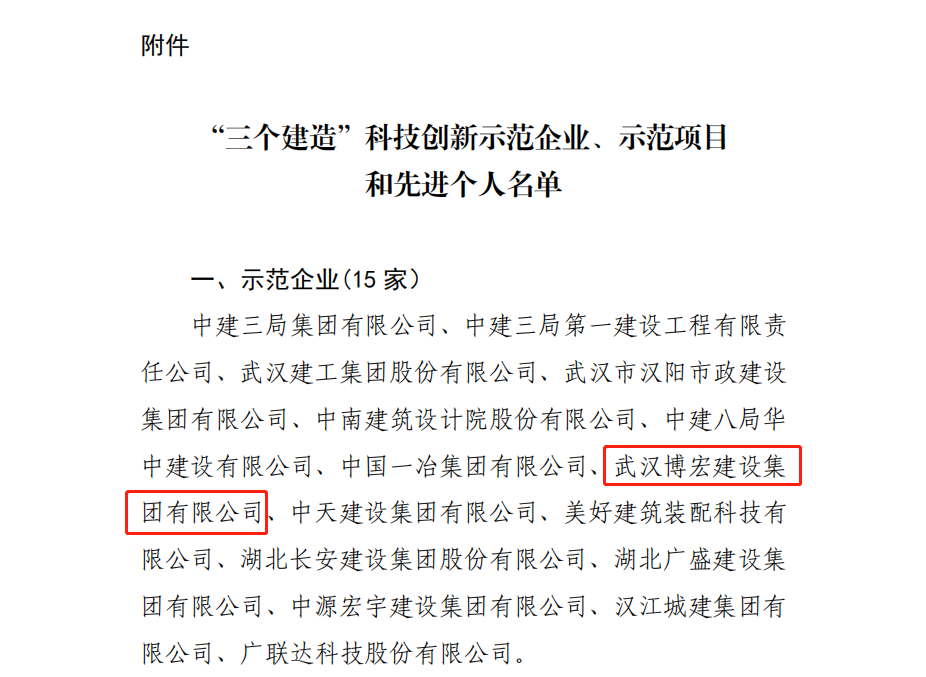 12月28日湖北省住房和城鄉(xiāng)建設(shè)廳發(fā)布關(guān)于綠色建造智能建造品質(zhì)建造科技創(chuàng)新工作情況的通報,博宏建設(shè)集團入選“三個建造”科技創(chuàng)新示范企業(yè);漢陽市政建設(shè)大廈(一標(biāo)段)、新建商務(wù)服務(wù)與設(shè)施項目(中南科研設(shè)計中心)項目入選“三個建造”科技創(chuàng)新示范項目;嚴(yán)俊、楊云華入選“三個建造”科技創(chuàng)新先進(jìn)個人。
