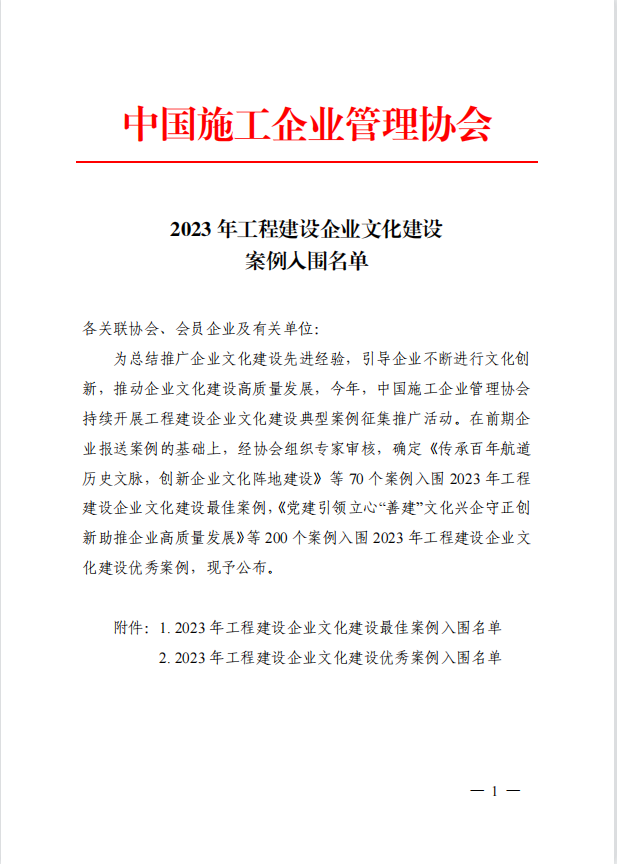 近日,中國施工管理企業(yè)協(xié)會發(fā)布2023年全國工程建設企業(yè)文化建設最佳案例、優(yōu)秀案例,由博宏建設集團申報的《文化賦能顯動力 創(chuàng)新融合促發(fā)展》獲評“企業(yè)文化建設優(yōu)秀案例”。