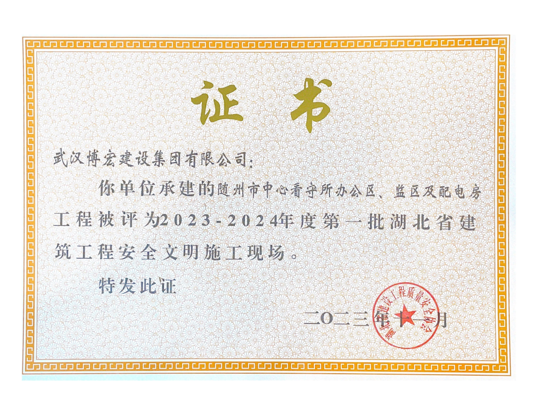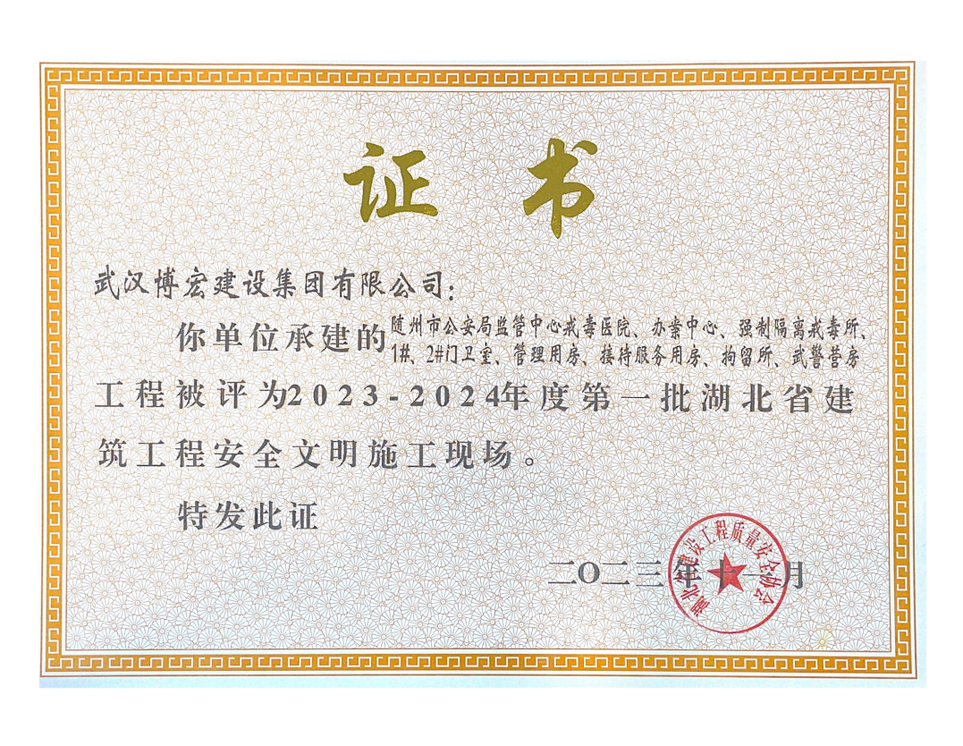 近日,湖北省建設(shè)工程質(zhì)量安全協(xié)會(huì)公布了2023-2024年度第一批湖北省建筑工程安全文明施工現(xiàn)場(chǎng)名單,由博宏建設(shè)集團(tuán)承建的隨州市中心看守所辦公區(qū)、監(jiān)區(qū)及配電房;黃金口產(chǎn)業(yè)園商業(yè)設(shè)施、居住、公園綠地建設(shè)項(xiàng)目;新建工業(yè)項(xiàng)目(漢陽(yáng)市政科研中心)(EPC)等8項(xiàng)工程獲評(píng)湖北省建筑工程安全文明施工現(xiàn)場(chǎng)。